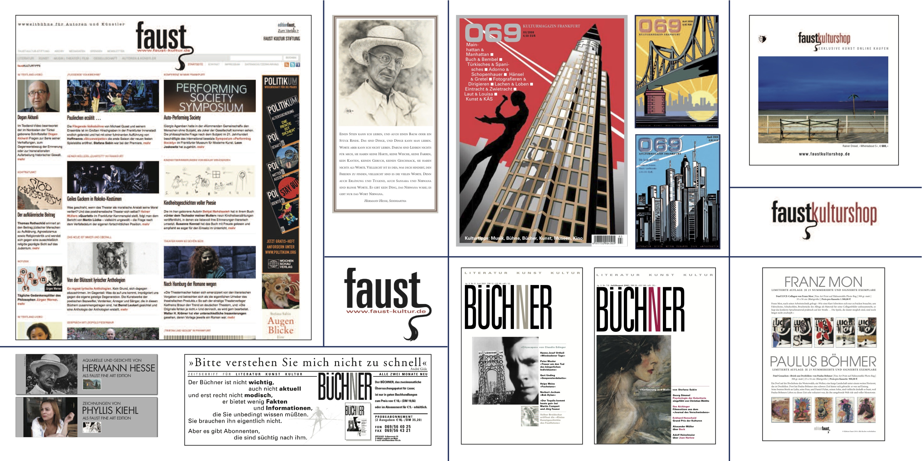 Das Onlinemagazin www.faust-kultur.de versteht sich als »Weltbühne für Autoren und Künstler«. In Berichten, Rezensionen, Interviews und Porträts kommen literarische, künstlerische und musikalische Themen ebenso zur Sprache wie philosophische, gesellschaftliche und politische Kontroversen. Texte, Fotos, Audios und Videos ergänzen einander oder wirken als eigenständige Kunstformen. Darüber hinaus gewährleistet die regelmäßige Aktualisierung einen stets angemessenen Informationsstand. Ein Archiv gibt den publizierten Inhalten langfristige Präsenz. Welche Themen behandelt und welche Beiträge aufgenommen werden, entscheidet die Redaktion.